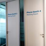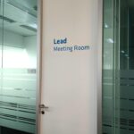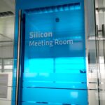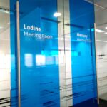 Decoração de portas de vidro e madeira, com vinil translúcido azul e prateado.
